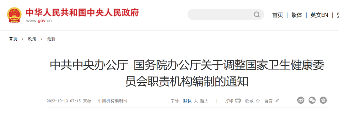 返回列表据中国机构编制网10月12日消息,经报党中央、国务院批准,中共中央办公厅、国务院办公厅发布《中共中央办公厅 国务院办公厅关于调整国家卫生健康委员会职责机构编制的通知》。