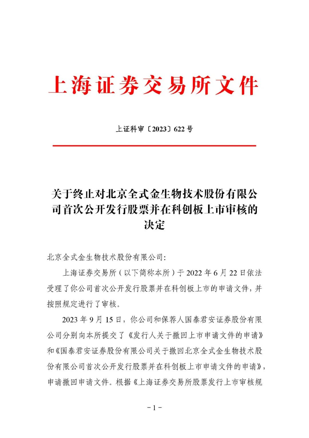 10月17日,上交所公布对北京全式金生物技术股份有限公司科创板IPO终止审核的决定,直接原因是公司及保荐机构国泰君安撤回申报/保荐。公司申报IPO于2022年6月22日获得受理,只公布了一版招股书,完成了首轮问询回复。