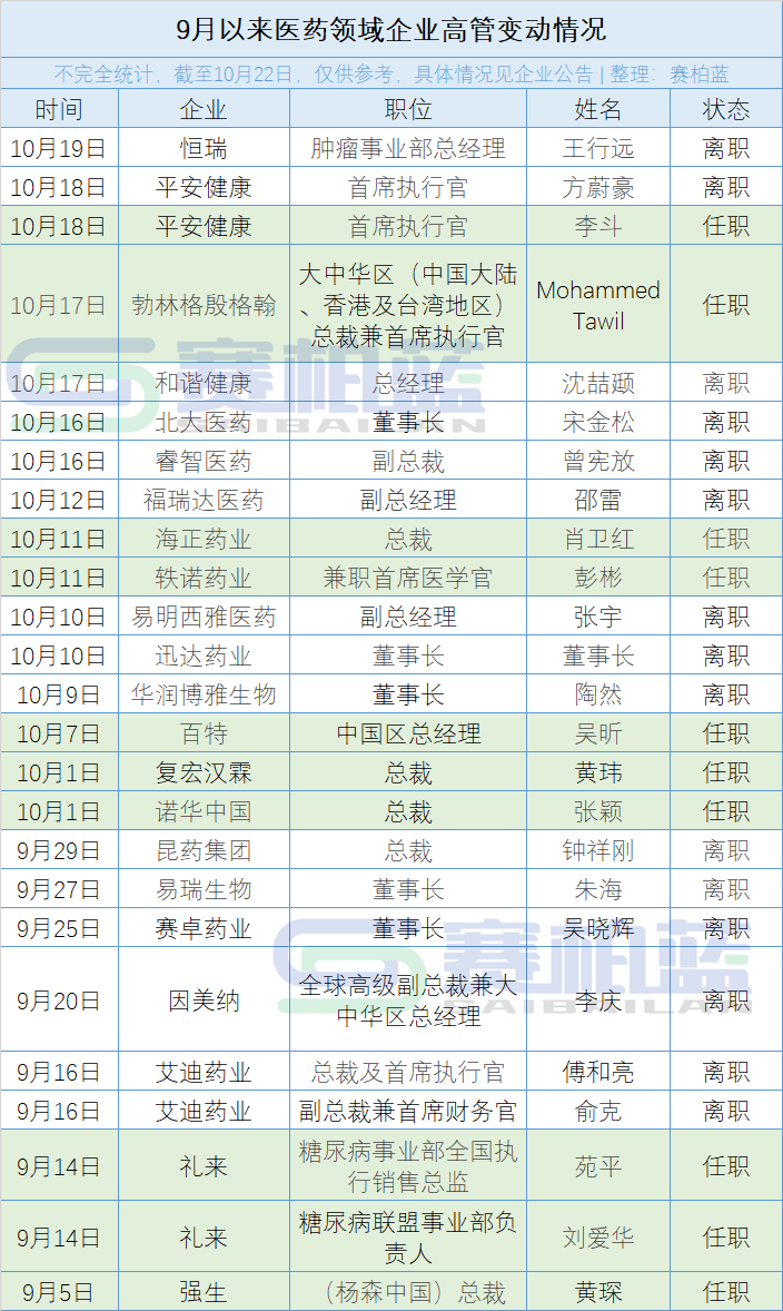 2023年“金九银十”即将过去,据赛柏蓝不完全统计,近两个月内,已有至少20家国内药企及跨国药企中国区董事长或总裁等高管职位出现人员变动(具体名单见文末)。
