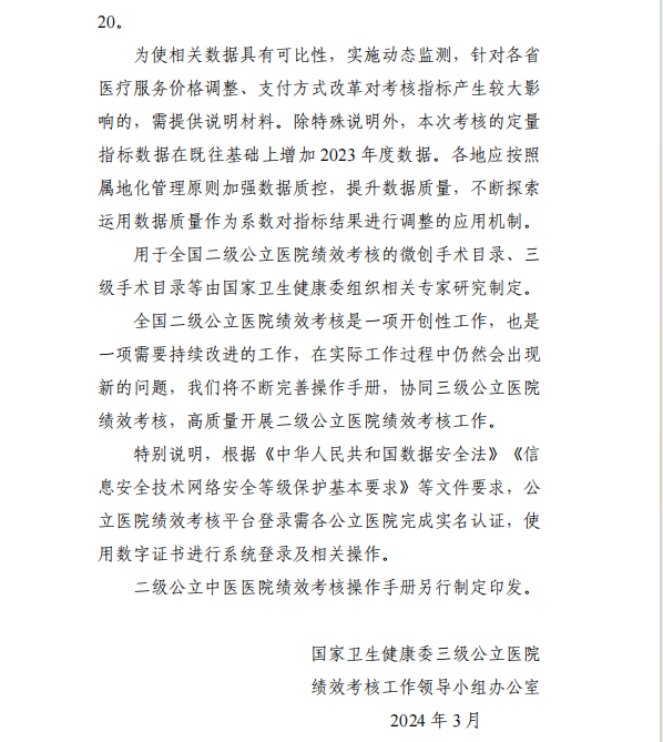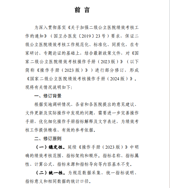 为持续提高二级公立医院绩效考核工作精细化水平,按照《关于加强二级公立医院绩效考核工作的通知》(国卫办医发〔2019〕23号)要求,根据实际工作需要和最新政策文件要求,我委对《国家二级公立医院绩效考核操作手册(2023版)》进行了修订完善,形成了《国家二级公立医院绩效考核操作手册(2024版)》(可从国家卫生健康委网站下载)。现印发给你们,请遵照执行。