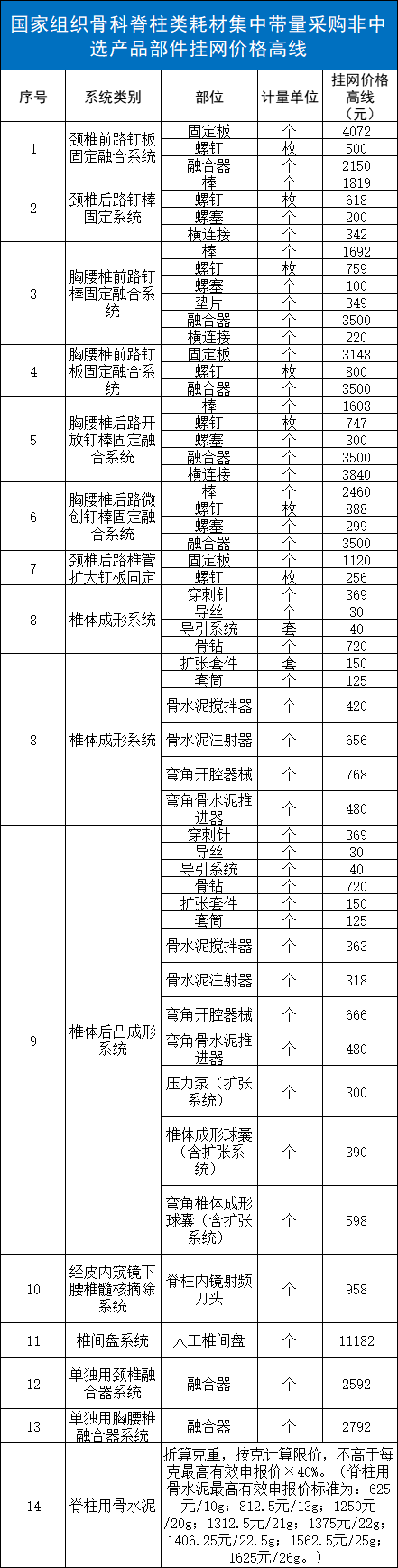 此次官方还一并下发《医用耗材带量采购非中选申报目录》,其显示目前已有骨科创伤、脊柱、人工晶体、超声刀等19大类耗材被纳入限价范围,并公布了各非中选产品部件的挂网价格高线。
