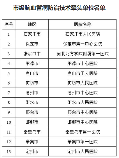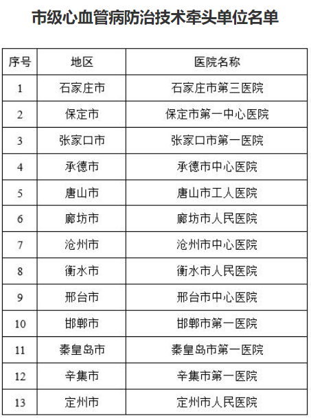 二、为高质量推动《健康河北行动—心脑血管疾病防治行动实施方案(2023-2030年)》任务目标落地,根据各地推荐情况,确定石家庄市人民医院、保定市第一中心医院等相关医院为市级(含定州、辛集,下同)心血管病和脑血管病防治技术牵头单位(名单见附件)。