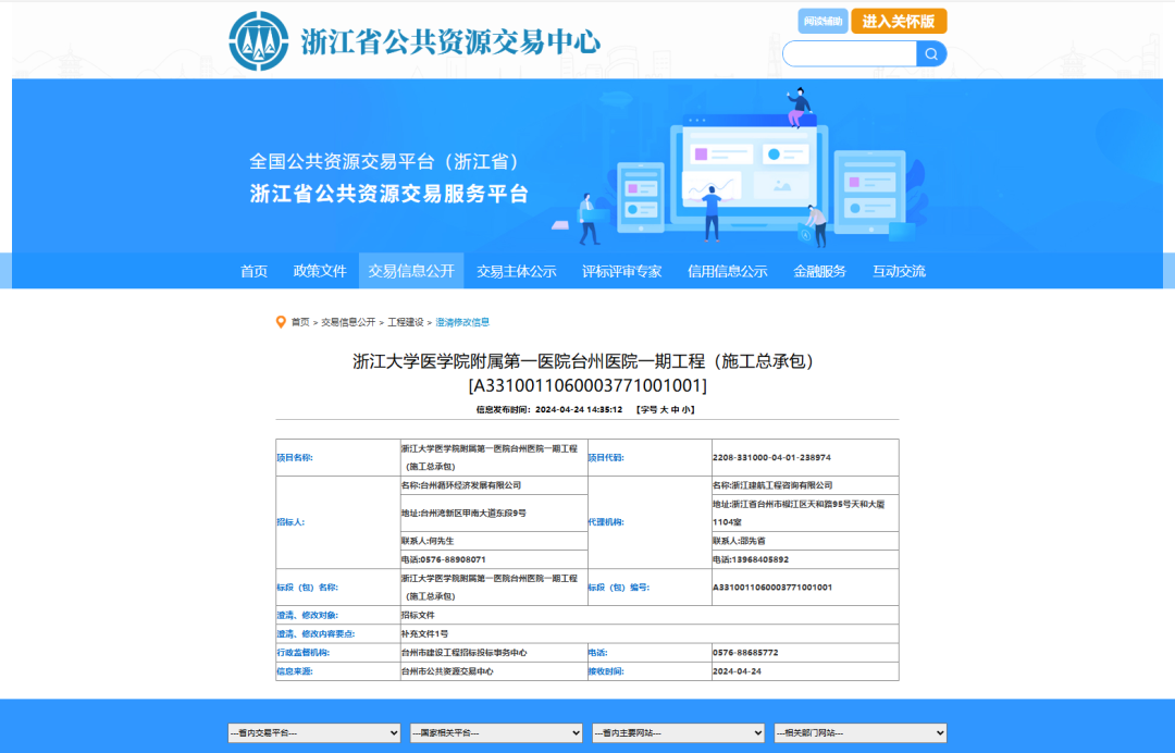 近日,浙江大学医学院附属第一医院台州医院一期工程(施工总承包)完成招标,第一中标候选人为森拓建设集团有限公司,工期1277日历天,中标价为661458042元。