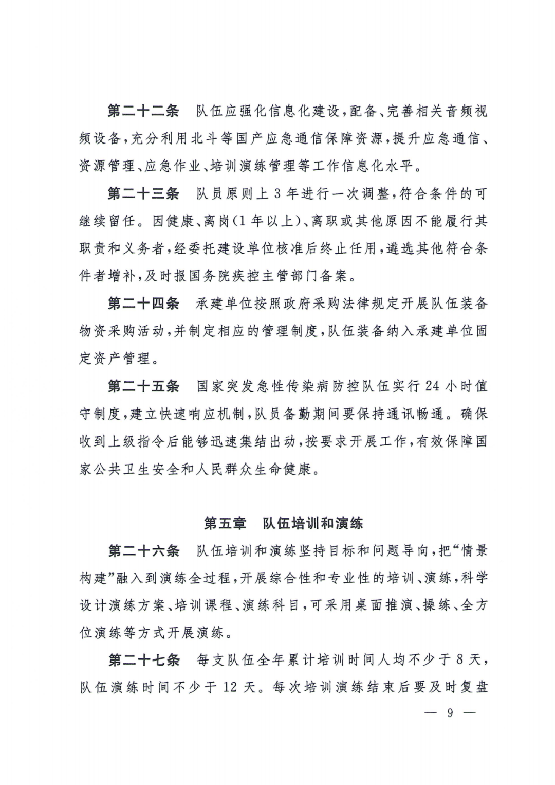 (五)队伍培训和演练。主要规定了队伍培训和演练总要求和原则、累计时间、演练形式等。