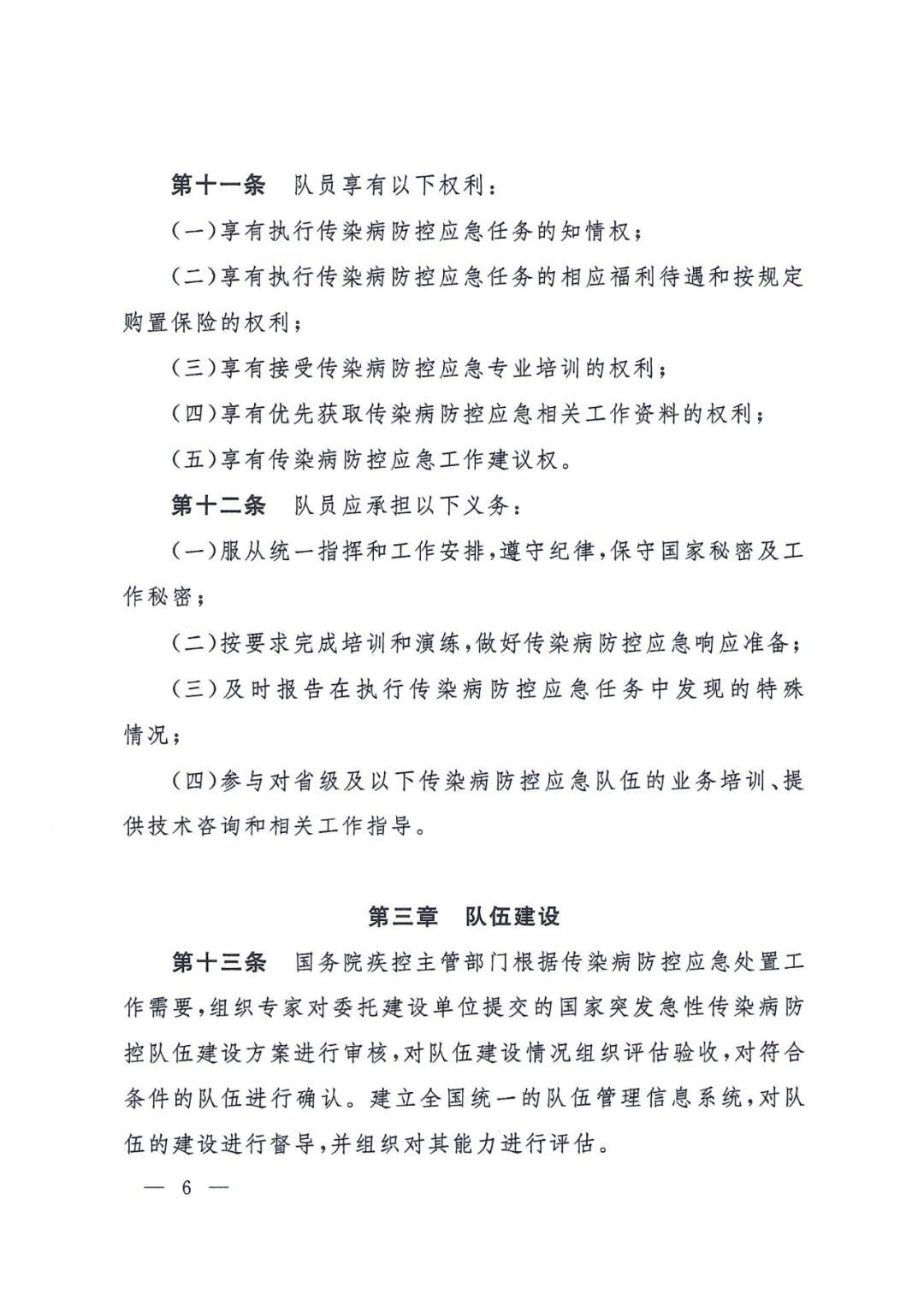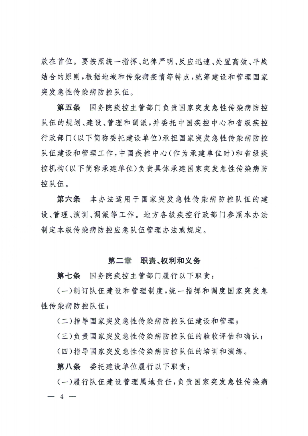 (二)职责、权利和义务。主要规定了国务院疾控主管部门、委托建设单位、承建单位的职责、国家突发急性传染病防控队伍职责,队员享有的权利和队员应承担的义务。