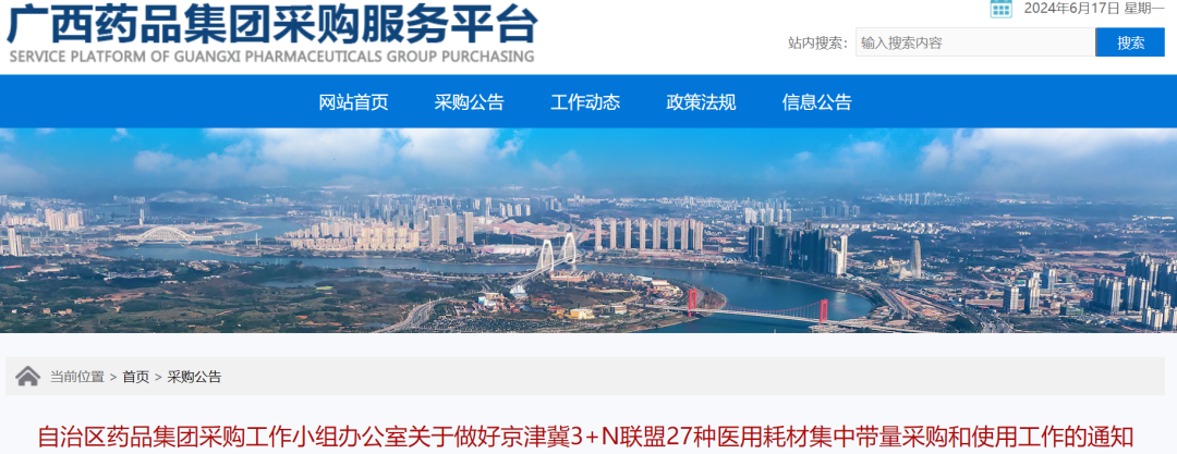 6月7日,广西药品集团采购服务平台发布《关于做好京津冀3+N联盟27种医用耗材集中带量采购和使用工作的通知》(简称《通知》),共计27类耗材中选结果将于6月28日在广西落地执行。
