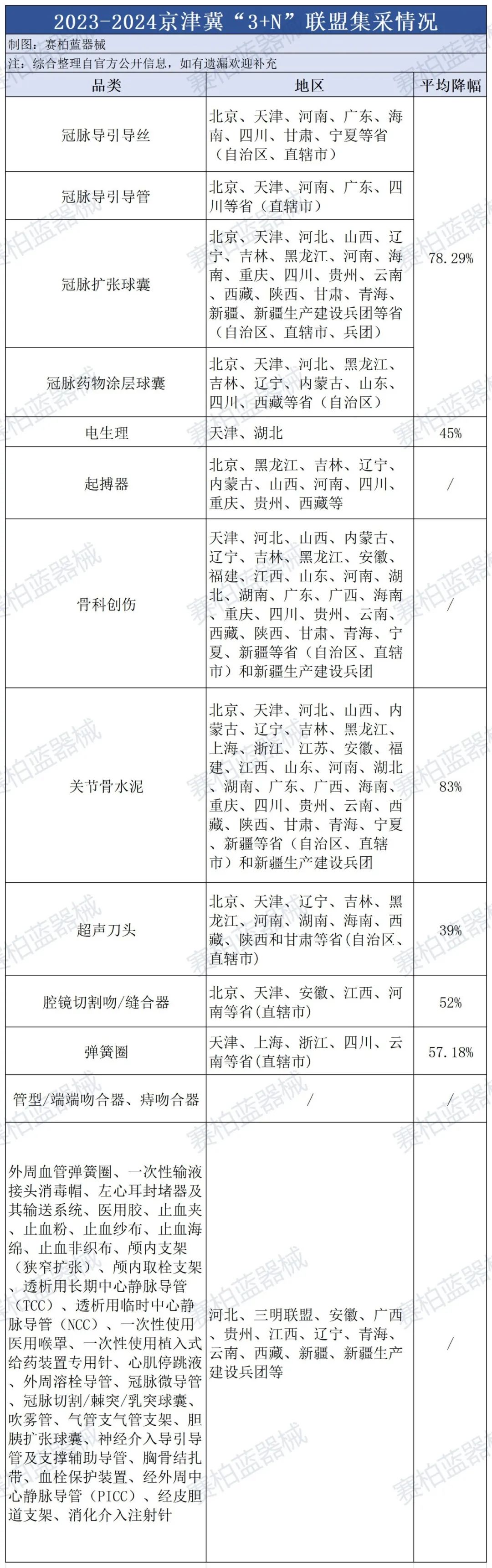 据不完全统计,京津冀“3+N”联盟近两年已开展了冠脉导引导丝、冠脉导引导管、冠脉扩张球囊、冠脉药物涂层球囊、电生理、起搏器、骨科创伤、关节骨水泥、超声刀头、腔镜切割吻/缝合器、弹簧圈、开放吻合器等多品类多批次耗材集采。