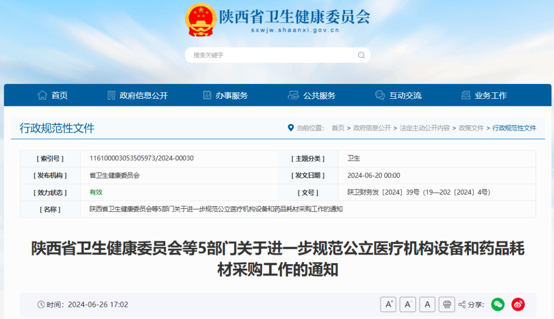 6月26日,陕西省卫健委发布《陕西省卫生健康委员会等5部门关于进一步规范公立医疗机构设备和药品耗材采购工作的通知》。