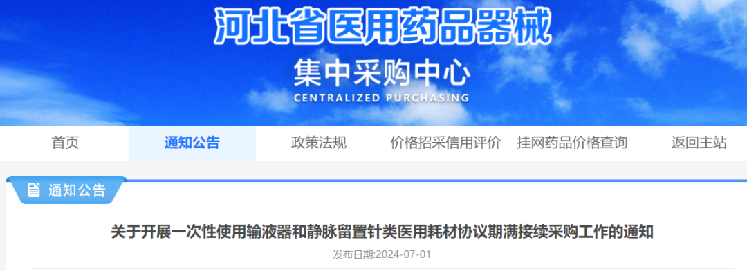 河北省医用药品器械集中采购中心发布《关于开展一次性使用输液器和静脉留置针类医用耗材协议期满接续采购工作的通知》,接续采购周期为2年,要求约定采购量不少于上一个采购周期采购量的80%。