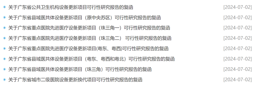 7月2日,广东发改委更新一批医疗设备更新项目可行性研究报告的复函。广东此轮医疗设备更新项目总投资超53亿元,涉及八大项目。